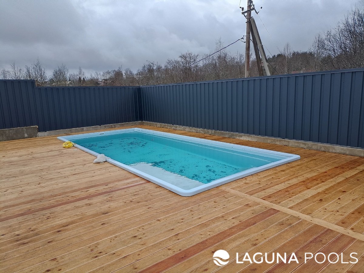 Голубой прямоугольный композитный бассейн на деревянной площадке, огражденный профлистом